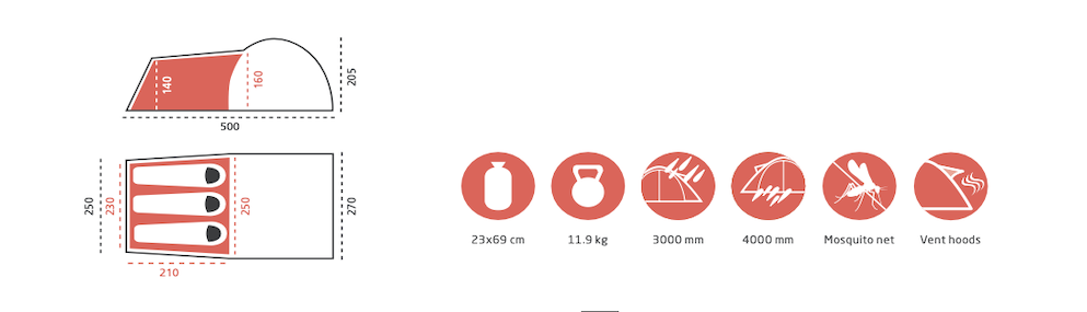 ATLANTA 3 is a dome/tunnel hybrid family tent, that offers a great sense of space and protects you from wind and weather. It is the single cabin version of the ATLANTA tent series. The large vestibule in front of the spacious sleeping cabin has stand-up height and allows you to enjoy your camping life together with your family or friends even if the sun won’t show or the rain compels you to stay inside your tent. Big flysheet vent hoods ensure proper ventilation and a good inner climate. The door can be put up as sunroof.