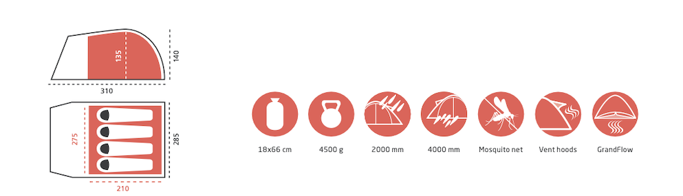 Need more space? TOPEKA 4 is the big brother of TOPEKA 2 and TOPEKA 3. It is considerably larger, offering plenty of space for four to five people, and comes with the same set of features. It has large vestibule area in front of the inner tent, that provides additional storage space for luggage or equipment. Great adjustable inner tent climate through the new “GrandFlow” fly sheet ventilation. The inner tent can be set-up separately in dry weather conditions. Great for biking, kayaking and camping weekends.