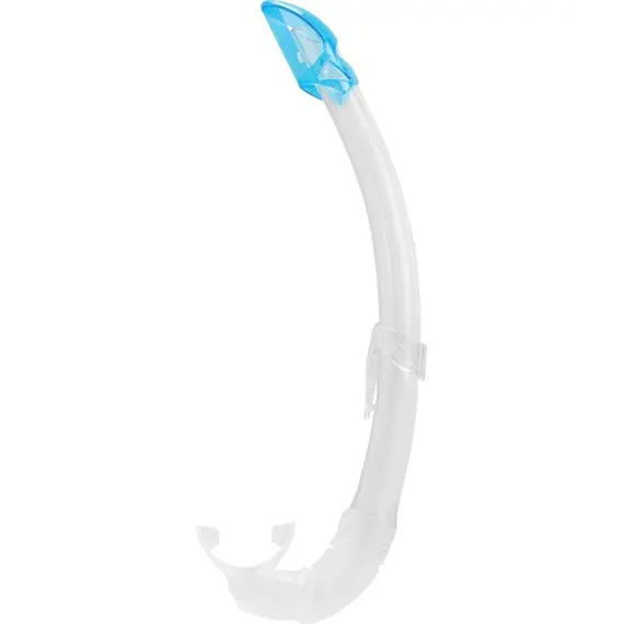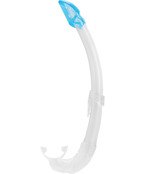 The Mexico snorkel is a high-end tube specifically studied to form a perfect fit on any face shape and features a completely rounded progressive profile. The upper baffle reduces water entrance due to waves with a design created to avoid damaging the air inlet flow. It has a transparent tube in a very flexible polyurethane with a mixed matte-gloss texture. The section of the tube walls is studied to maintain the necessary stiffness in the pressure zone of the mask strip to support air circulation in this area. It has a very comfortable mouthpiece with a design that combines different thicknesses to favor its self-orientation and relieve the tension of the user’s jaw after long use. The nozzle/tube connection is especially safe against possible accidental separation. Versatile for use placed on the left or right side of the face. The snorkel keeper it is easy to have fixed to the mask for securing it.