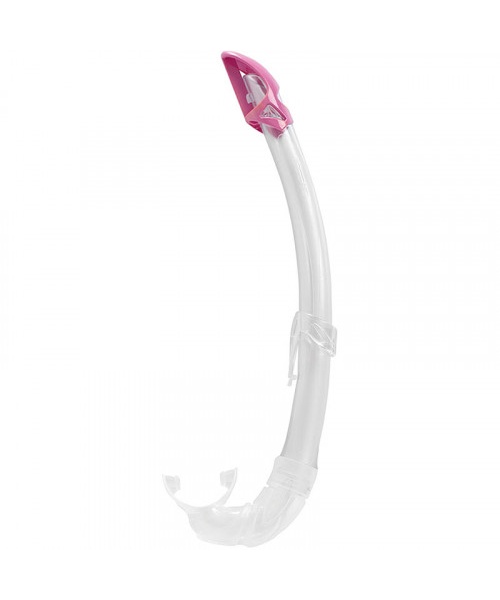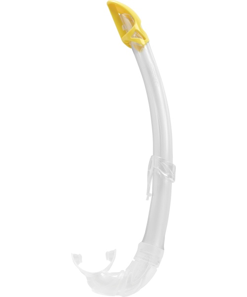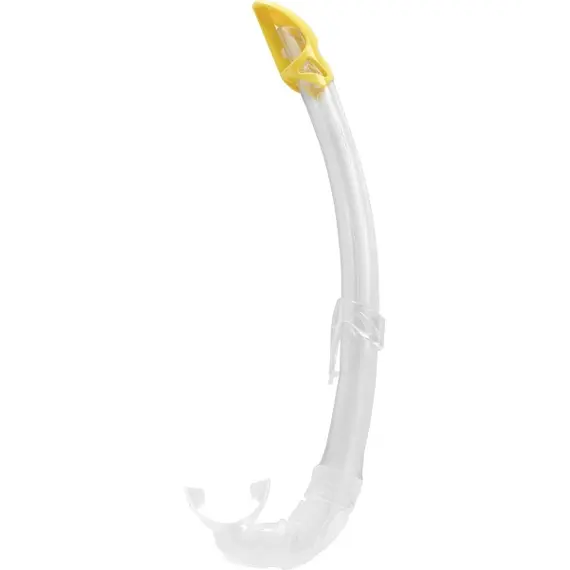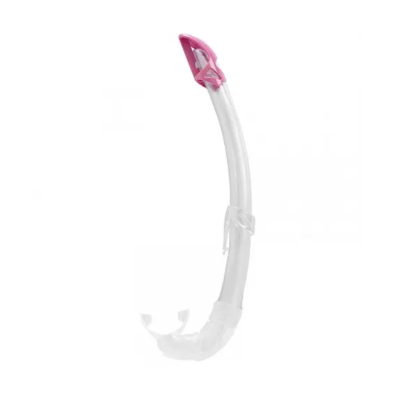 The Mexico snorkel is a high-end tube specifically studied to form a perfect fit on any face shape and features a completely rounded progressive profile. The upper baffle reduces water entrance due to waves with a design created to avoid damaging the air inlet flow. It has a transparent tube in a very flexible polyurethane with a mixed matte-gloss texture. The section of the tube walls is studied to maintain the necessary stiffness in the pressure zone of the mask strip to support air circulation in this area. It has a very comfortable mouthpiece with a design that combines different thicknesses to favor its self-orientation and relieve the tension of the user’s jaw after long use. The nozzle/tube connection is especially safe against possible accidental separation. Versatile for use placed on the left or right side of the face. The snorkel keeper it is easy to have fixed to the mask for securing it.